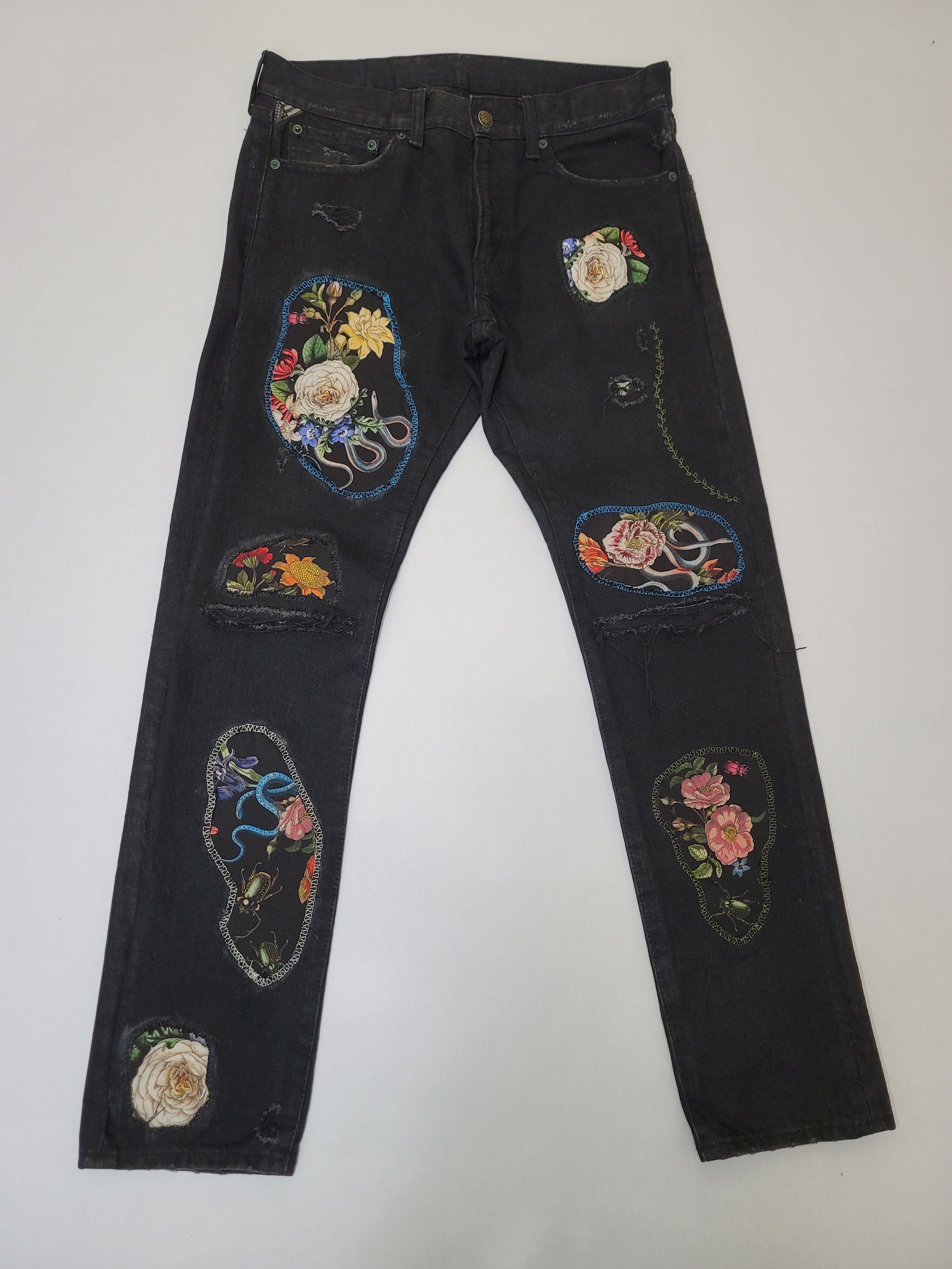 "Introducing a one-of-a-kind fusion of timeless vintage and street edge: Custom Ralph Lauren Denim & Supply jeans reimagined. These jeans blend the rugged quality of classic denim with a bold twist—an intricately detailed fabric featuring a vibrant flower garden. But look closer, and you’ll notice snakes weaving through the floral, lurking in stealthy positions, ready to strike.